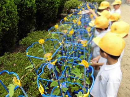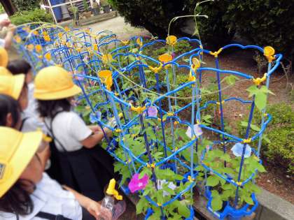 子どもたちは、「3つも咲いてる!」「水色の花が咲いた!」と