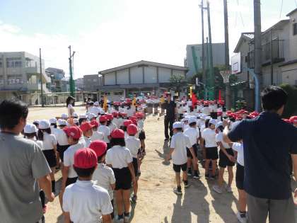 久々に晴れた朝、今日は運動場で全体練習を行いました。