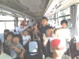 バスに乗り込み「はい、ポーズ!」