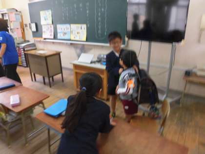 初めて教室に入る幼稚園の子どもたちは、最初ドキドキしていましたが、ひらがなフラッシュカードや、百玉そろばん、英語の歌を一緒にしていく中で慣れてきて、1年生と一緒に楽しんでいました。
