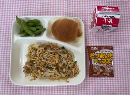 26日は「焼きそば、えだまめ、おさつチップス、牛乳」、