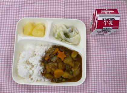 27日は「ビーフカレーライス、野菜のピクルス、りんご(カット缶)、牛乳」でした。