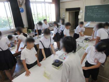 「水よう液の性質」の学習で、塩酸に溶けて見えなくなった金属はどうなったのか、液体を蒸発させる実験で確かめました。