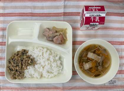 今日の給食は「ごはん、鶏肉のゆず塩焼き、ソーキ汁、ツナ大豆そぼろ、牛乳」でした。