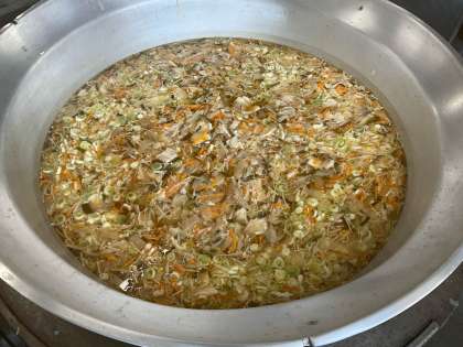 ソーキ汁の豚ばら肉は、先にゆでて余分なあぶらを落としています。だし、切りこんぶ、豚肉のうま味でおいしく仕上がりました。そぼろには粒状の大豆が入っていましたが、ツナも入っていたので食べやすかったようです。