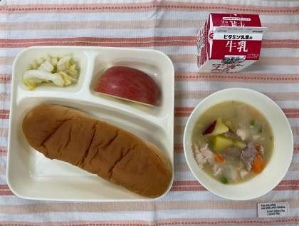 2日の給食は「黒糖パン、鶏肉とさつまいものシチュー、はくさいのピクルス、りんご、牛乳」でした。シチューはさつまいもの甘みもあり、おいしく仕上がりました。