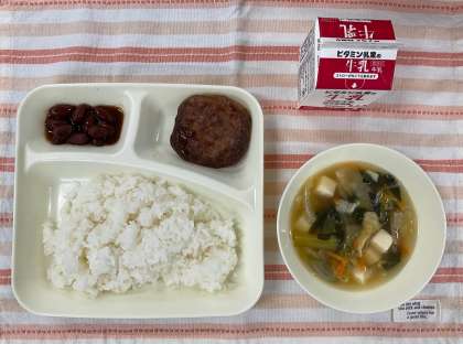 今日は「ごはん、和風ハンバーグ、五目汁、金時豆の煮もの、牛乳」でした。和風ハンバーグは大好評!楽しみすぎて、最後まで食べずにいた子もいたようです。金時豆は柔らかく仕上がっていました。苦手な子も多い豆ですが、チャレンジしてくれる子もたくさんいました。