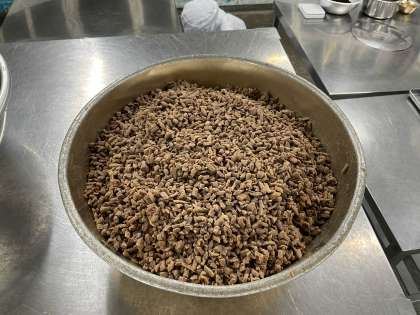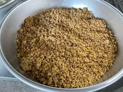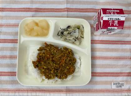 今日の給食は「大豆入りキーマカレーライス、キャベツのひじきドレッシング、和なし(カット缶)、牛乳」でした。キーマカレーライスには、粒状の大豆が入り、食感も楽しめました。また、今回は豚レバーチップも入っていましたが、カレー風味のおかげでほとんど気にならずにおいしく食べることができました!