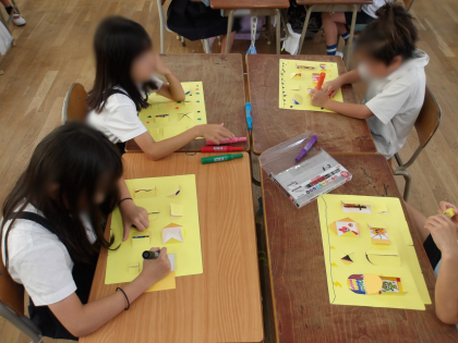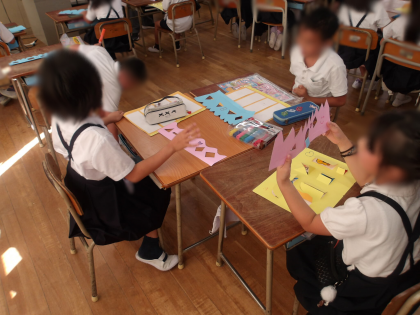 カッターを使って紙に切り込みを入れて窓を作りました。窓を開けると見えるものを想像して絵を付け加えました。