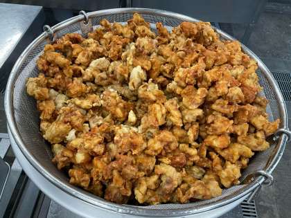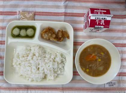 今日の給食は、学校給食献立コンクール入賞献立でした。「ごはん、とり天、どさんこ汁、抹茶団子、牛乳」です。とり天は下味をつけた鶏肉に衣をつけて揚げています。くっつきやすくて調理員さんは大変そうでしたが、おいしく出来上がり大好評!抹茶だんごは、きな粉をかけていただきました。