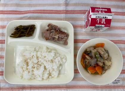今日の給食は「ごはん、豚肉の梅風味焼き、ふきよせ煮、くきわかめのつくだ煮、牛乳」でした。梅風味焼きは、ほんのり梅風味が大好評!ふきよせ煮は、れんこんやさといも、こんにゃく、鶏肉などよくかめる具材が入っていました。くきわかめもコリコリと少しかみごたえがあり、今日はしっかりかんで食べることができた献立です。