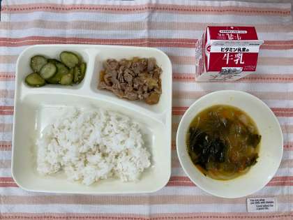 4日の給食は「ごはん、豚肉のコチジャンいため、鶏肉とはるさめのスープ、きゅうりのナムル、牛乳」でした。コチジャンいためは、コチジャンの旨辛さが好評!甘みもあるので、低学年もおいしく食べることができました。