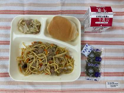 6日は「ミニコッペパン、ウインナーときのこの和風スパゲッティ、焼きツナキャベツ、固形チーズ、牛乳」でした。和風スパゲッティはきざみのりをかけていただきました。具だくさんでボリュームもあり、好評の献立でした。