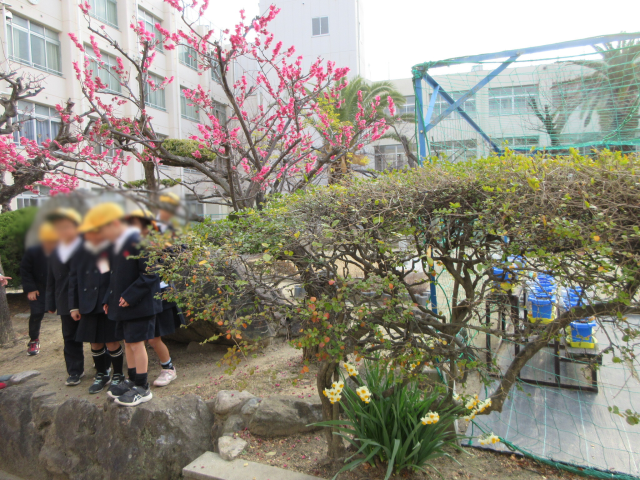 1年生が中庭の鉢植えで育てているチューリプから芽が出ました。