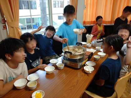 宿舎の人が用意してくださった美味しいかも鍋を班のみんなといただいています!