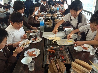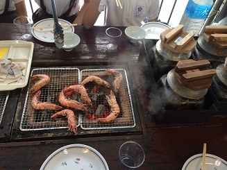 お昼ご飯は、みんなそれぞれが調理した釜飯と海鮮バーベキューです。