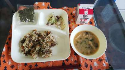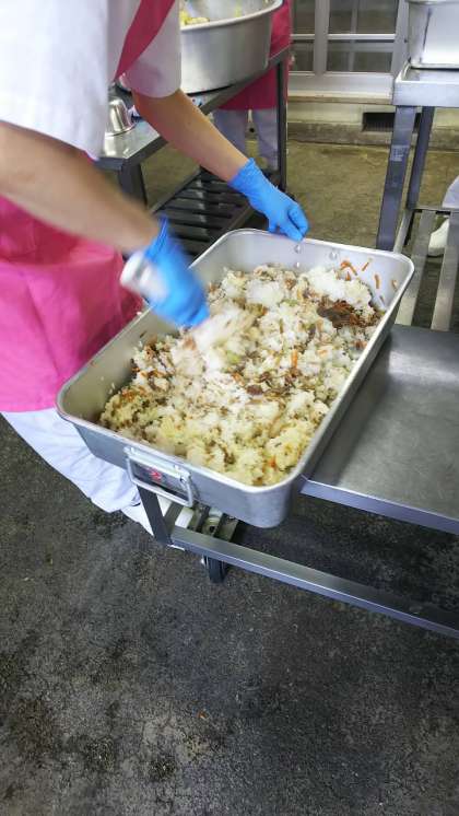 まぜごはんは給食室で白いごはんを炊き、味つけした具と混ぜます。