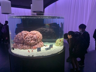テーマごとに分かれた水槽を覗き込み、生き物の特性を楽しんで学んでいます。