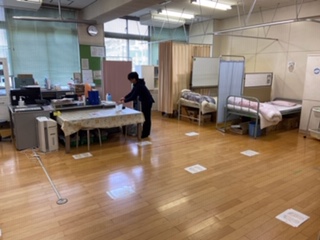 つぎは、ほけんしつです。けがをしたり、しんどくなったりしたときに、みてもらうへやです。