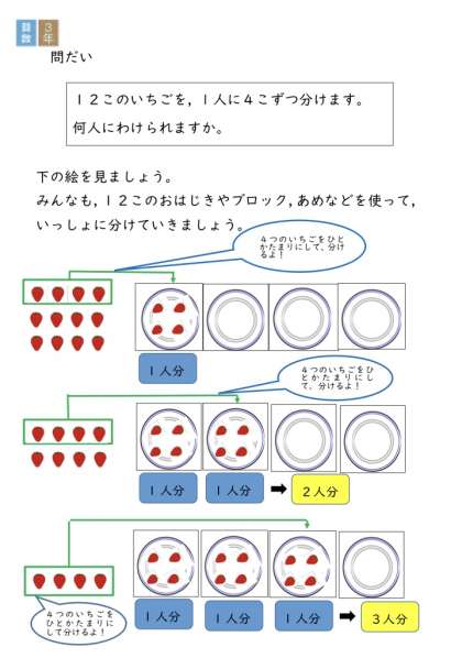 今回は、前回と少しちがう『わり算』の学習です。どこがちがうかを考えながら、進めていきましょう。