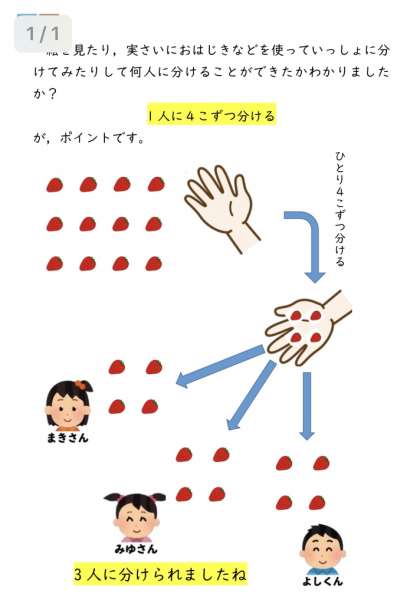 前回は、『同じ数ずつ分けます。1人分は何こになりますか?』という問だいでしたね。