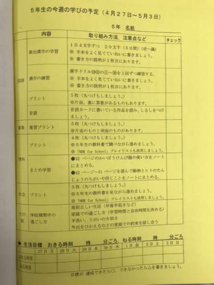 オレンジ、緑、黄色が表紙の3週間分の課題は5月3日に終了です。間に合いそうにないぞという人はこっそりゴールデンウィークに終わらせましょう。