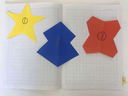 写真の答え 1.線対称 2.線対称 3.線対称、点対称 でした。