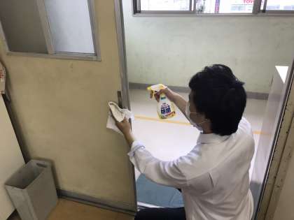 今日の写真は子どもの入れ替わりの際に消毒をしている様子です。