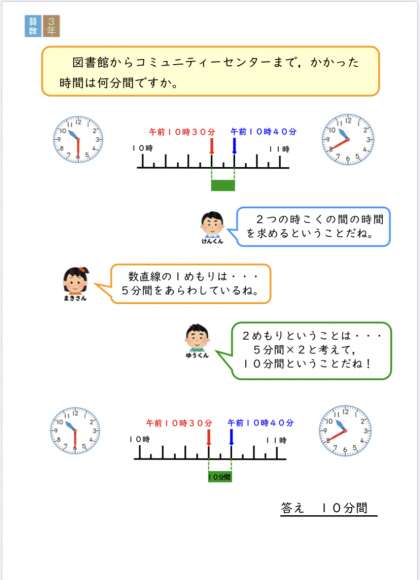 1つ目は、算数の『時間の計算と短い時間(2)』です。前回、学習したことを思い出しながら進めましょう。どんな学習か楽しみですね。