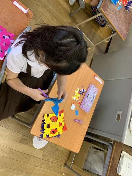 図工では、折り紙を使って、「ちょきちょきかざり」を作りました。はさみを上手に使いながら、次々に出来上がる色々な模様に、大喜びしていました。七夕も近いので、お家でも七夕飾りにぜひ作ってみてください。