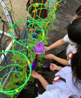 生活科では、楽しみにしていたアサガオの花が咲き始めたので、みんな大喜びでした。ピンクや紫、水色など、色とりどりの花が、とてもきれいです。また、2年生が作ってくれた校内の地図を持って、学校探検にも行きました。初めて4階に上がり、家庭科室やパソコン室などを見学しました。自分たちの教室にはないものがたくさんあって、とても驚いた様子でした。