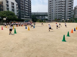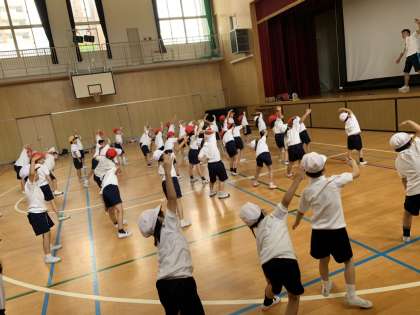 夏を感じさせる暑さの中、熱中症にならないように、講堂と運動場を交代で使いながら体育をしました。体を動かす機会が少ないので、子どもたちは体操やサーキットに、喜んで取り組みました。
