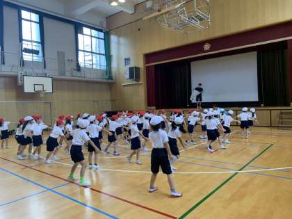 体育は、表現運動をしました。新聞紙をヒラヒラさせたり、丸めたりするのを見て、それを体で表現します。子どもらしい発想のユニークな動きもあって、とても楽しそうでした。