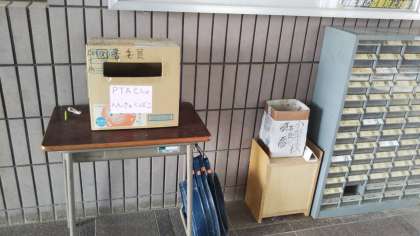 先日ご連絡しておりましたPTA図書及びDVD返却の件ですが、専用のBOXを作成し、職員室横(ベルマーク入れ棚の机の上)に設置致しましたので、ご返却がまだの方、お子様を通じて10月末までにご返却をお願い致します。