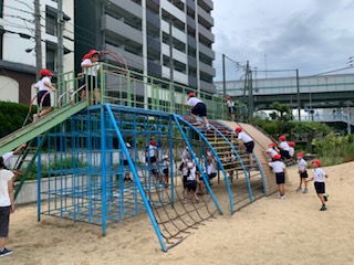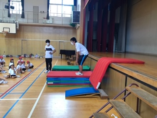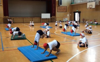 天候によっては、暑さの和らぐ日もあり、体育の時間は、運動場の遊具を使ったり、講堂ではマットを使ったりして、思い切り体を動かして体力づくりをしています。来週からは、少しずつ運動会の練習も始まります。水分補給のために、水筒を忘れないようにお願いします。
