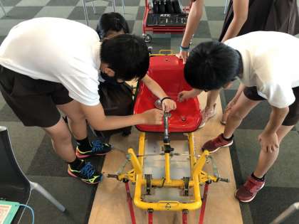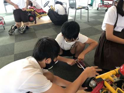 メカニック体験では、車の組み立てから分解まで班ごとに協力して行いました。車の仕組みを学習しながら楽しんで作業しています。