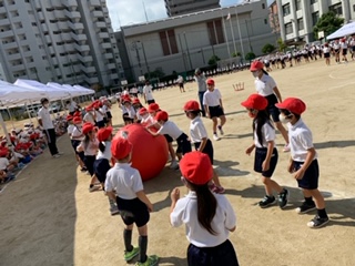 全校競技の大玉リレーでは、奇数学年、偶数学年に分かれて、大玉を転がしました。