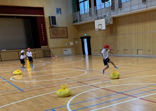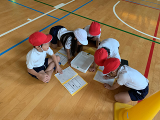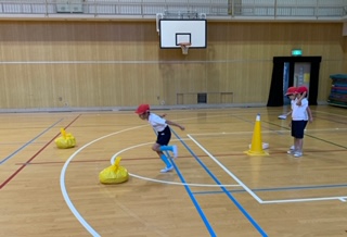 体育の授業では、色々な用具を使ってコースを作り、走る練習をしています。どうやったら速く走れるか、自分たちで話し合って、コース作りをしています。タイムが速くなると、とてもうれしそうです。