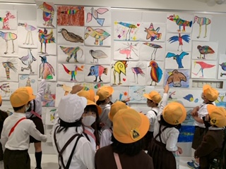 以前、子どもたちが黒田征太郎さんの絵に色を塗った作品も展示されているということで、子どもたちはとても楽しみにしていました。展示室に、自分の作品が飾られているのを見つけると、みんな大喜びでした。