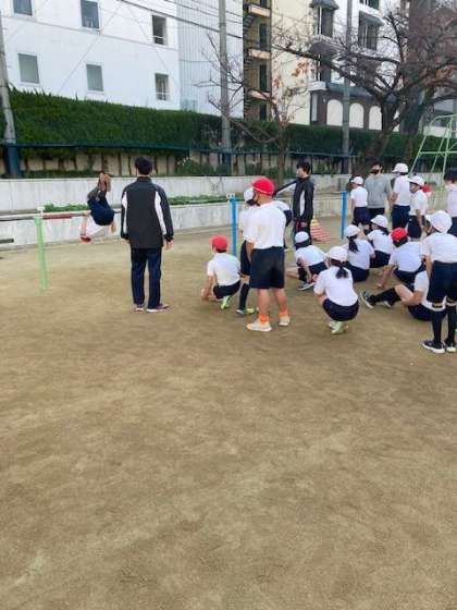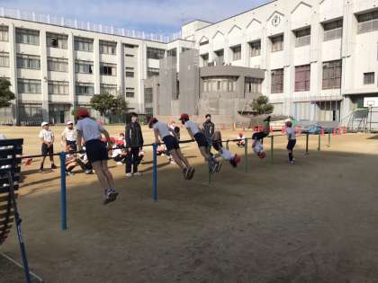 鉄棒の握り方、5秒ぶら下がりなど、基本的・基礎的な練習から、目線、腕の使い方、踏み込み、蹴り上げのコツなど「逆上がり」がうまく出来るための活動まで、45分間行いました。