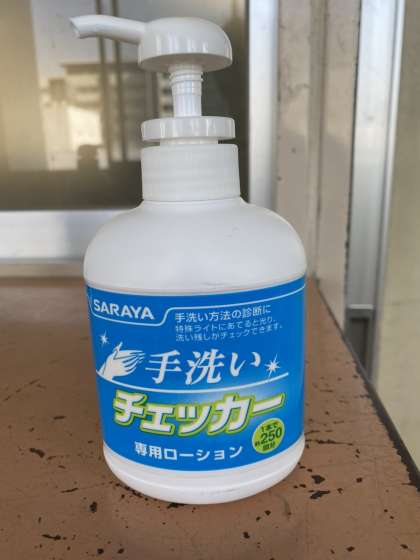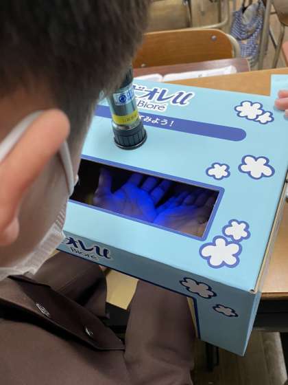 最後に手洗いチェッカーで丁寧に手洗いできているか実験しました。