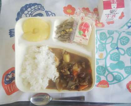 牛肉と金時豆のカレーライス、ごぼうサラダ、パインアップルです。