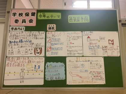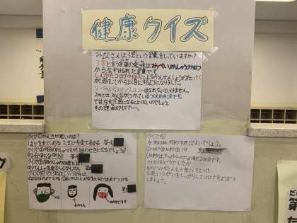 健康委員が自分たちで調べたことをまとめ、掲示物を作ったり、クイズを作ったり、動画を作りました。健康委員が作ったまとめやクイズは保健室前に掲示しています。