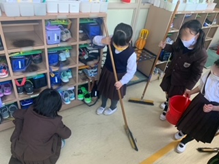 掃除も、自分たちで手際よくできるようになりました。ほうきやぞうきんは、最近の家庭の掃除では使うことが減っていると思いますが、学校ではゴミを集めたり、机を拭いたりと、上手に使えるようになってきました。