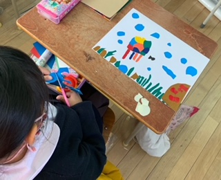 図工の時間は、紙版画にチャレンジしています。国語で学習した「スイミー」のお話から、自分の好きな場面を選んで作っています。スイミーや赤い魚たちはもちろん、にじいろのゼリーのようなくらげ、水中ブルドーザーのようないせえびなど、色とりどりの海の中の様子が、その子らしく表現されています。版画の刷り上がりが楽しみです。