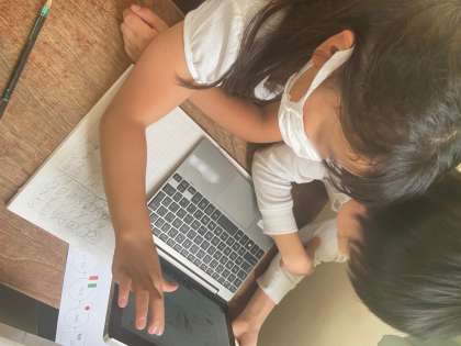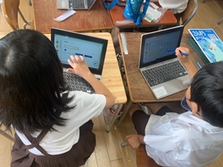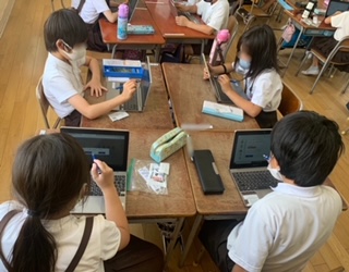 また、一人一台端末を使って、調べ学習をしたり、国語と算数のドリル学習に取り組んだりもしました。ドリル学習は、自分のペースで進めることができ、問題に正解すると卵から生まれた生き物が進化していくので、子どもたちは楽しそうに問題を解いています。困った時は、お互いに教え合ったりする姿も見られました。