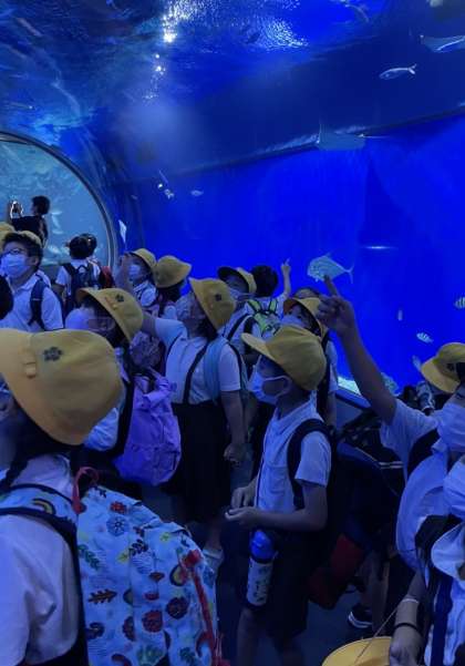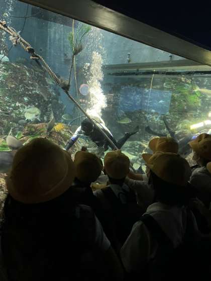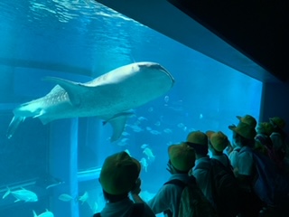 海遊館の中では、大きな水槽の中にいるいろいろな生き物を、みんな釘付けになって見ていました。近くで見るジンベエザメは、迫力満点!