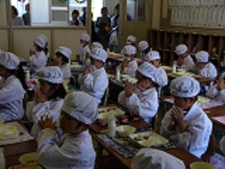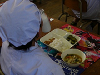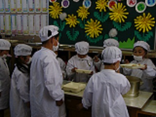1年生は、自分たちで重たい食缶を取りに行けるようになりました。