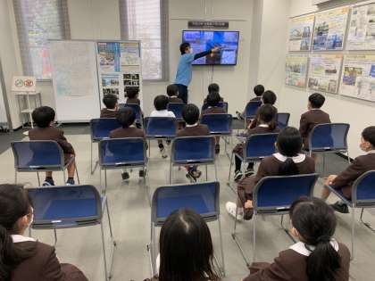 今週は、生活科の学習で町たんけんに行きました。校区内にある津波高潮ステーション、西警察署、九島院、野島製作所の4つの施設に分かれて見学をしました。