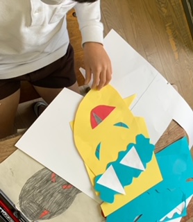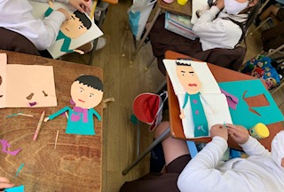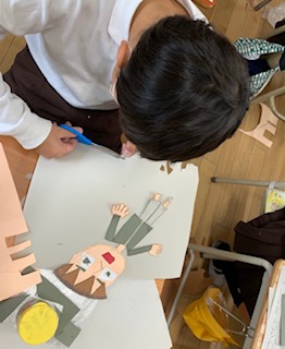 雪だるまを作っているところや凧揚げをしているところなどの冬の風物詩を、画用紙を切り貼りして作っています。顔の表情や手足の動きなど、細かい部分を作るのに悪戦苦闘しながら頑張っています。